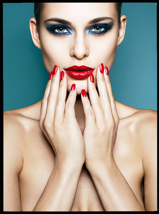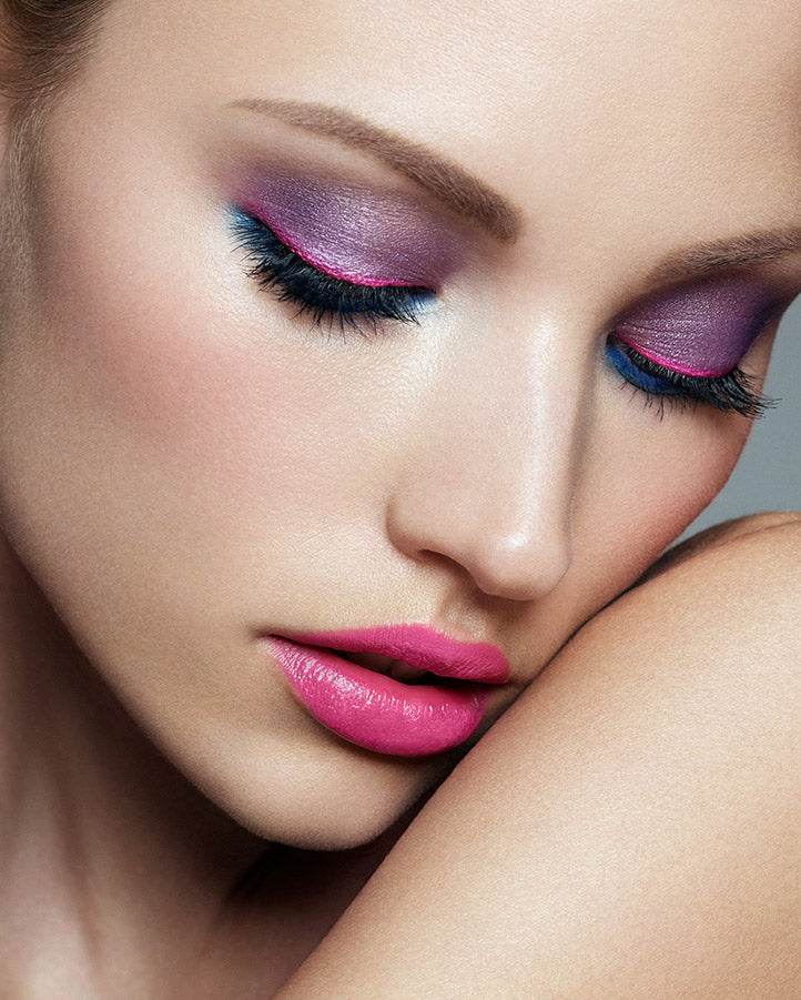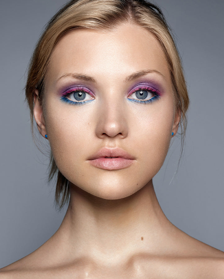 Inspired by 80's 'Glam' from the covers of Vogue and iconic music clips such as 'Simply Irresistible'. Whilst blue eyes are not always suited to all eye colours and skin tones, by keeping intense colours deep and jewelled, it can elevate the look.